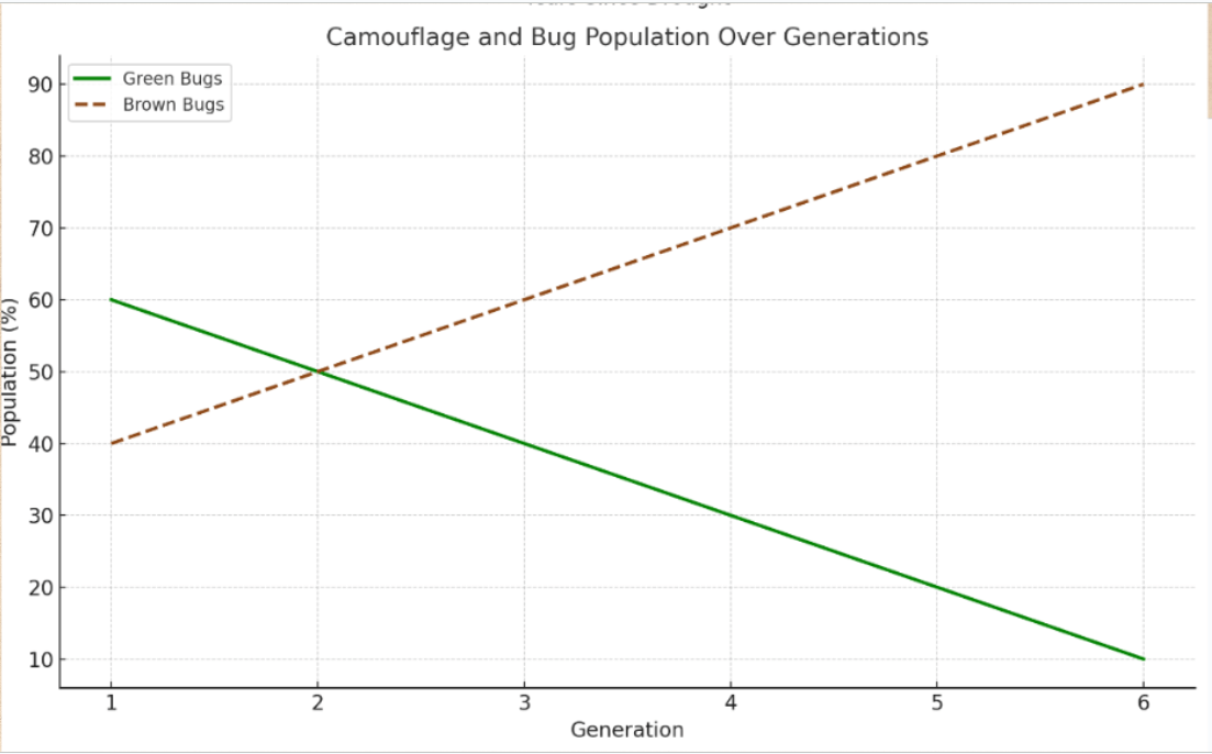 The graph shows that the green beetle population decreased and the brown beetle population increased due to the environment changing.