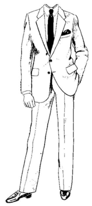 It is worn by men and women. It has two parts; a jacket and matching pants. Men wear it with a tie.