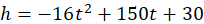 A golfer, standing on the third deck at a driving range, hits a golf ball 30 feet above the ground with an initial vertical velocity of 150 feet per second. The function  represents the height h (in feet) of the golf ball after t seconds.