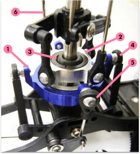 Transfers the movement of cyclic and collective from stationary push-pull to rotating push-pull movements that are transferred to the rotor system. Components: (1) Non-rotating outer ring (2) turning inner ring (3) ball joint (4&5) roll & pitch control (6) links to rotor blades.