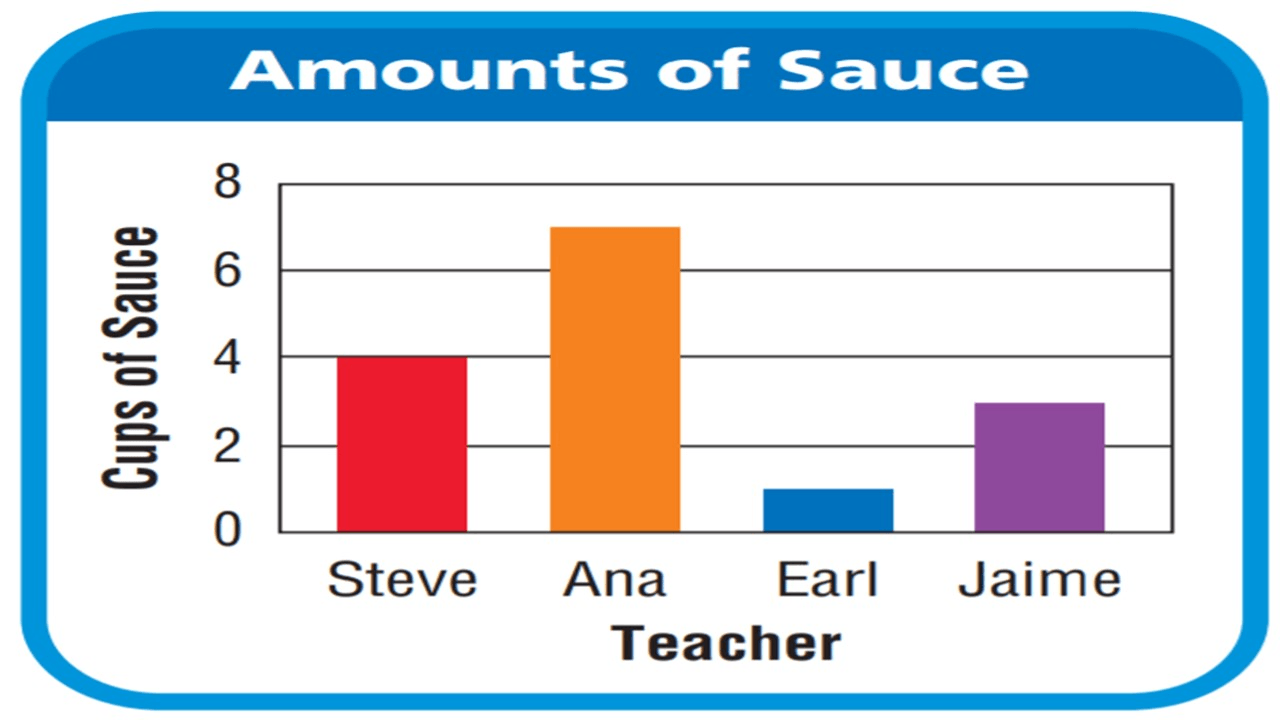 The teachers at Marty’s school are in a pasta-cooking contest. The bar graph shows the amounts of sauce they use in their recipes. What is the difference between the greatest and least amounts of sauce?