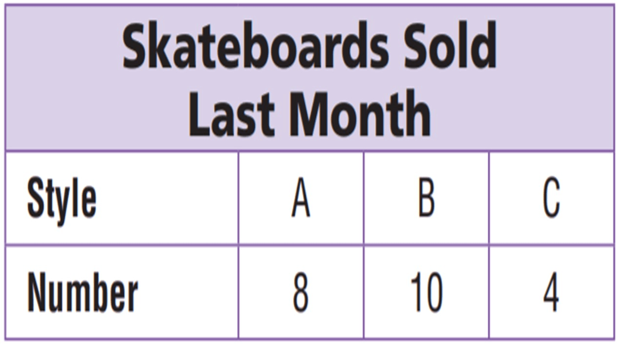 Trevor recorded the skateboards that were sold last month in a frequency table. He will display the data in a bar graph. How many bars will the graph have?