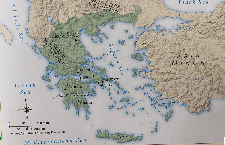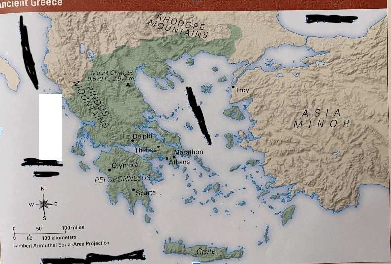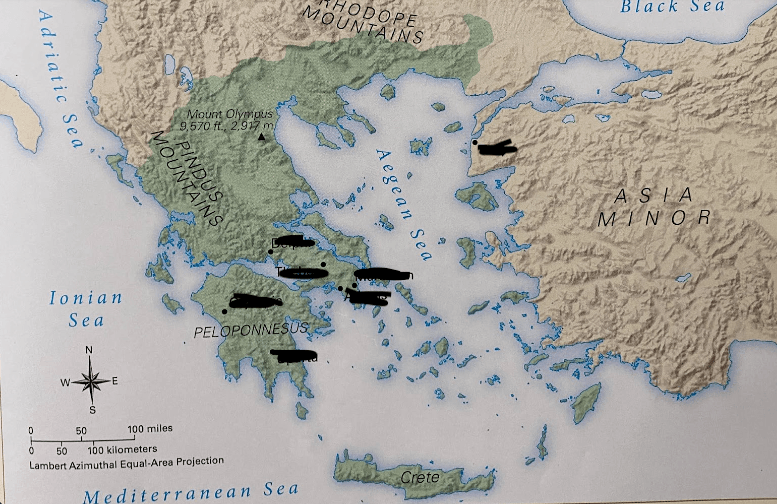 Correctly identify the location of Athens, Sparta, and Troy on the map below: