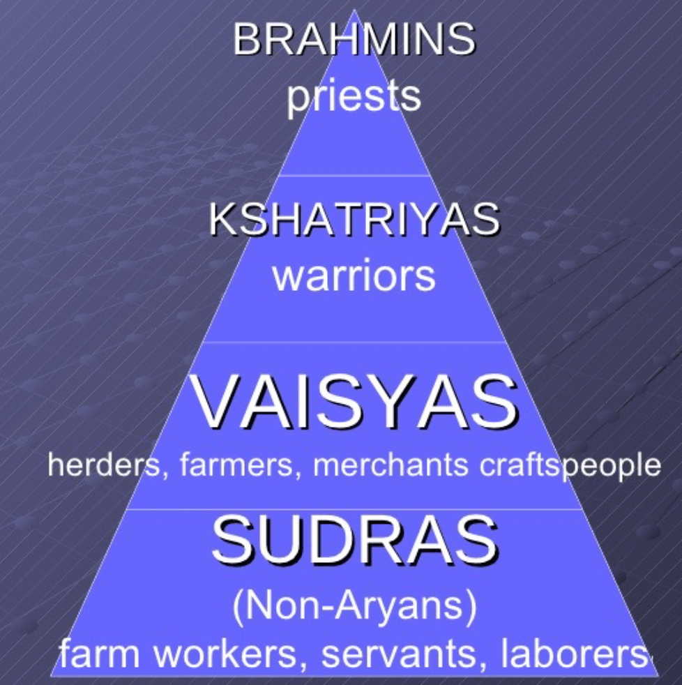 The rigid or fixed Hindu social order or hierarchy that included Brahmins, Kshatriyas, Vaisyas, Sudras, and Untouchables.