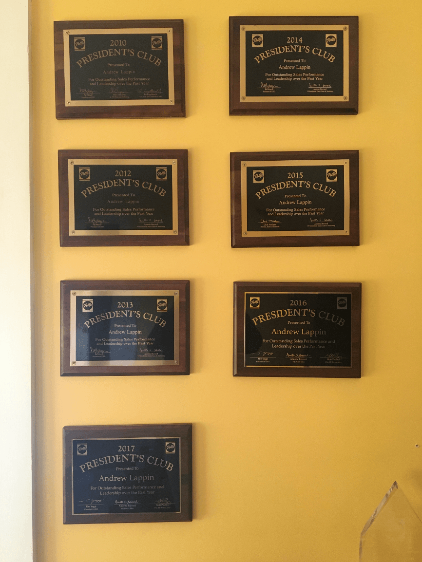 Spanning from 2010 to present day Andrew holds Presidents Club awards from Pella for every year except this one.