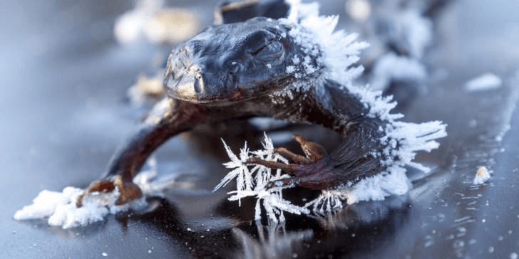 This amphibian can be found frozen solid during the winter time on the east coast. This unique creature slows it's heart rate down in order to survive this frigid environment.