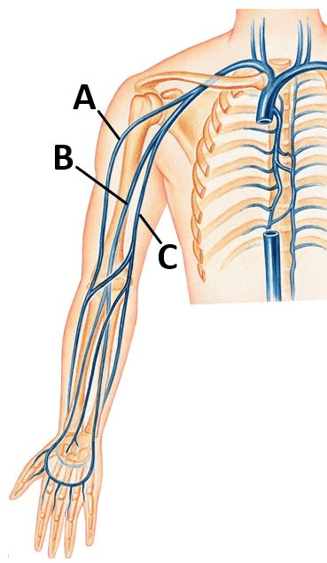 Identify which is the brachial vein, cephalic vein, & basilic vein:
