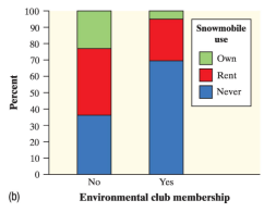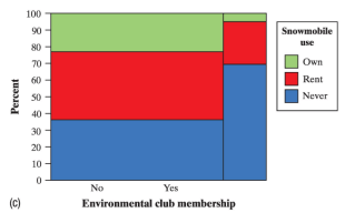 True or False? The segmented bar chart about suggests that a greater number of people that are in the environmental club have never owned a snowmobile than those who are not in the environmental club.