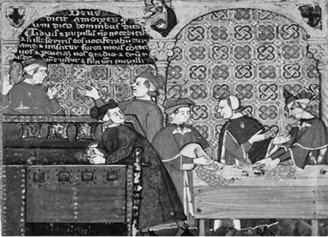 The Latin text in the upper left-hand corner warns against greed. The commercial practices shown in the images emerged in order to.