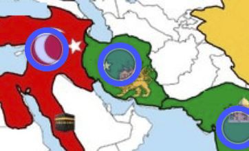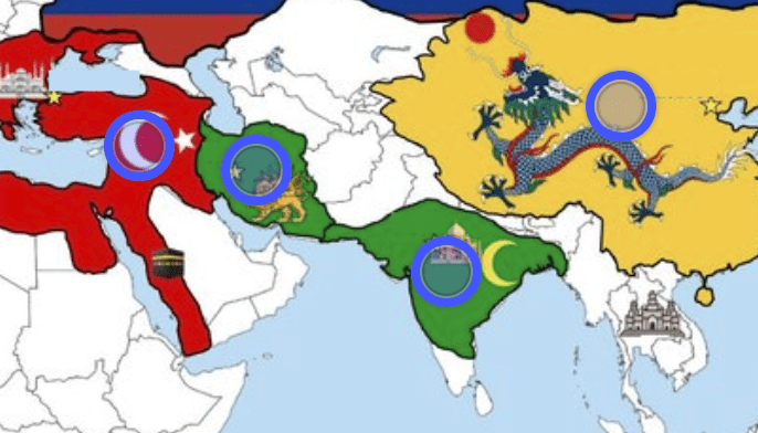 From left to right: Ottomans, Safavids, Mughals, Qing China