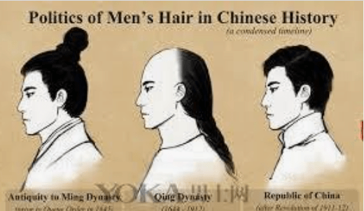 This hairstyle called queues, was worn by Qing officials, who were ethnically Manchus. They also forced the majority Han population to wear their hair in this style in order to show obedience.