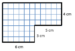 A figure composed of two rectangles. Rectangle one has a base of 6 and a height of 4. Rectangle two has a base of 5 and a height of 4. Find the area (show working and a diagram)