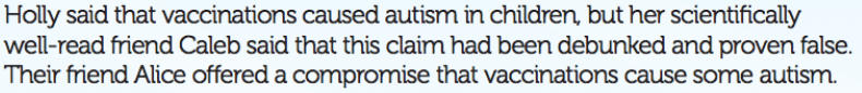 Another example from Bingo: Some people claim that God is all powerful, all knowing, and all good. Other people claim that God does not exist at all. Now, it seems reasonable to accept a position in the middle - God exists but he in only very powerful, very knowing, and very good. That seems right to me.