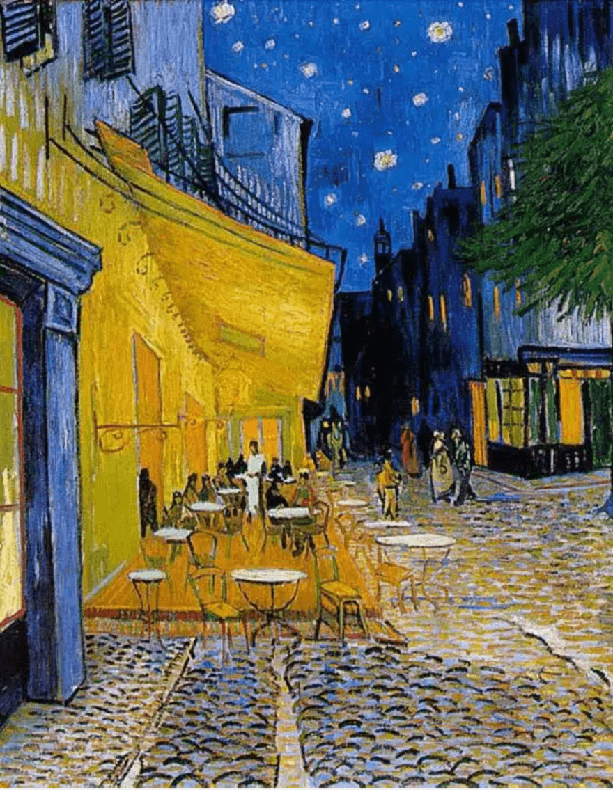 Van Gogh and his use of (blue & orange) _________ colors in Café Terrace on the Place du Forum, Arles, 1888.