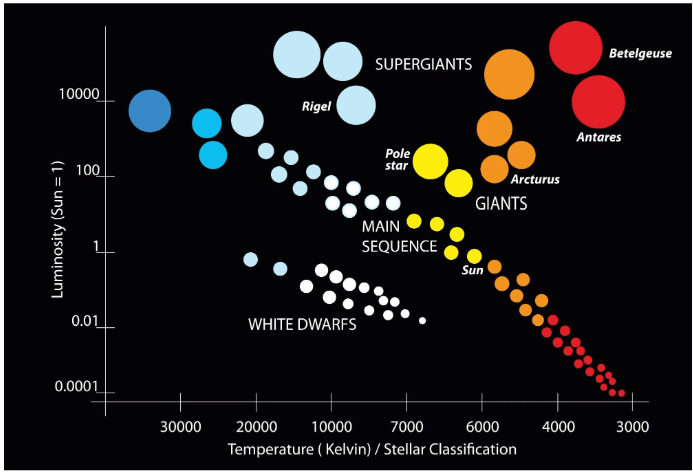 This diagram plots stars by their luminosity and spectral class (temperature).