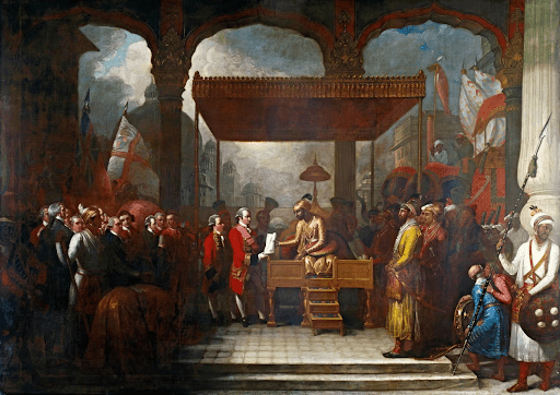 The British East India company (will accept just British) and an Asian/Indian kingdom or people are making a deal.