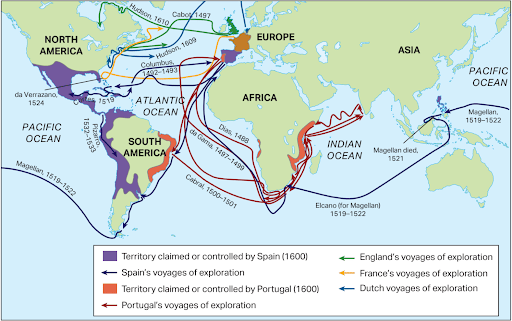 Based on this map, what 2 European countries had done the most exploring and colonizing in the 16th century?
