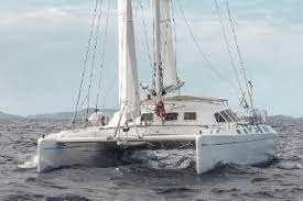 A boat with two parallel hulls or floats, often a sailboat with a mast.