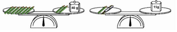 The scales in the pictures had been balanced. There are pencils and a pen on the arms of the scales. What is the weight of the pen in grams?