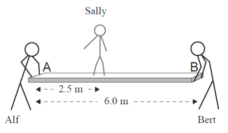 How much more force is Alf applying than Bert if Sally has a mass of 50kg?