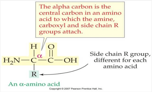 Center Carbon attached to a hydrogen, amine group, carboxyl group and R group which is specific to each amino acid.