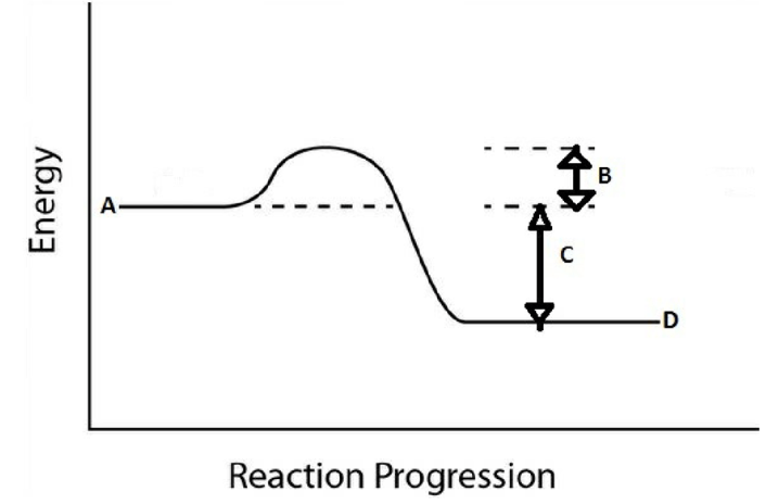 Enzymes speed up reactions by lowering the activation energy.  Which letter on the diagram represents activation energy?