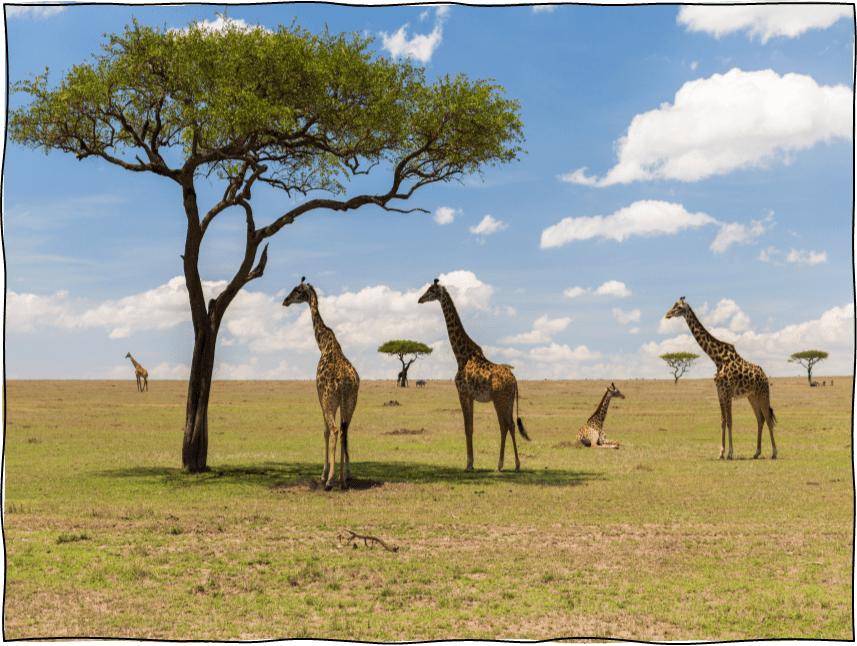 Grasslands with hot weather, scattered trees, and amazing wildlife like lions