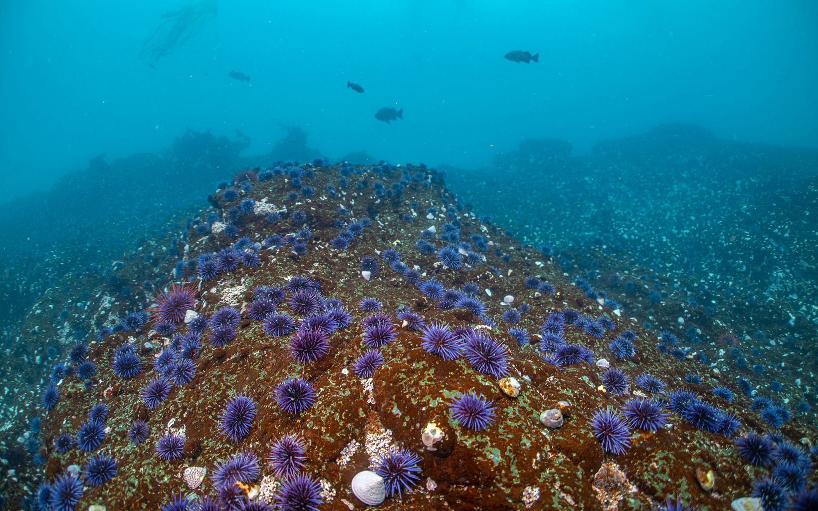 A communal Urchin that lives in hoards. One of these hoards can have hundreds of potentially thousands of Urchins, and together they devastate kelp forests by chewing away at the base of the stem (stipe)- eventually creating Urchin Barrens