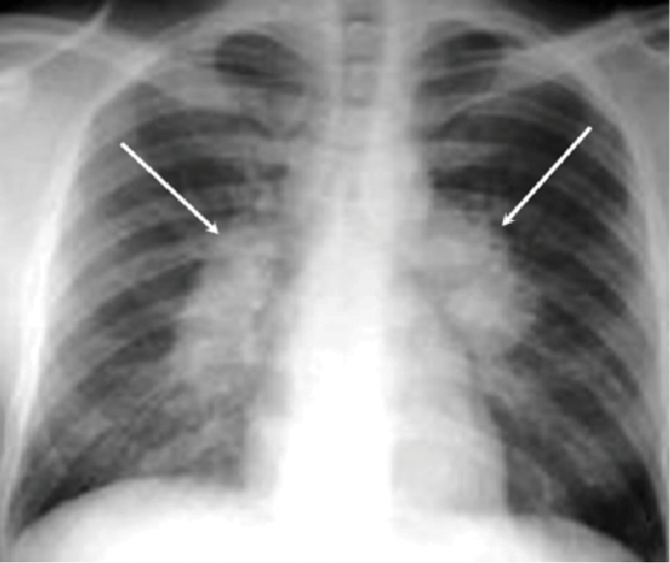 A  3 y/o patient who recently visited family in Mexico presents with 3 weeks of cough, weight loss, and feeling sweaty at night. This is the most common chest x-ray finding associated with this diagnosis.