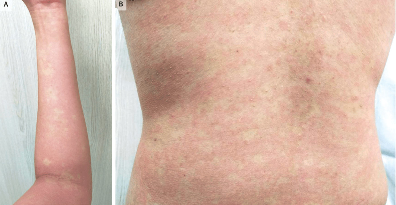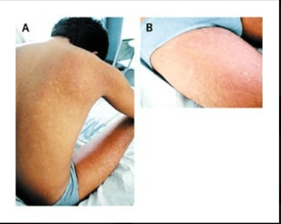 - early rash is macular / morbiliform and coalesces into the rash above, red with "white islands" of spared skin