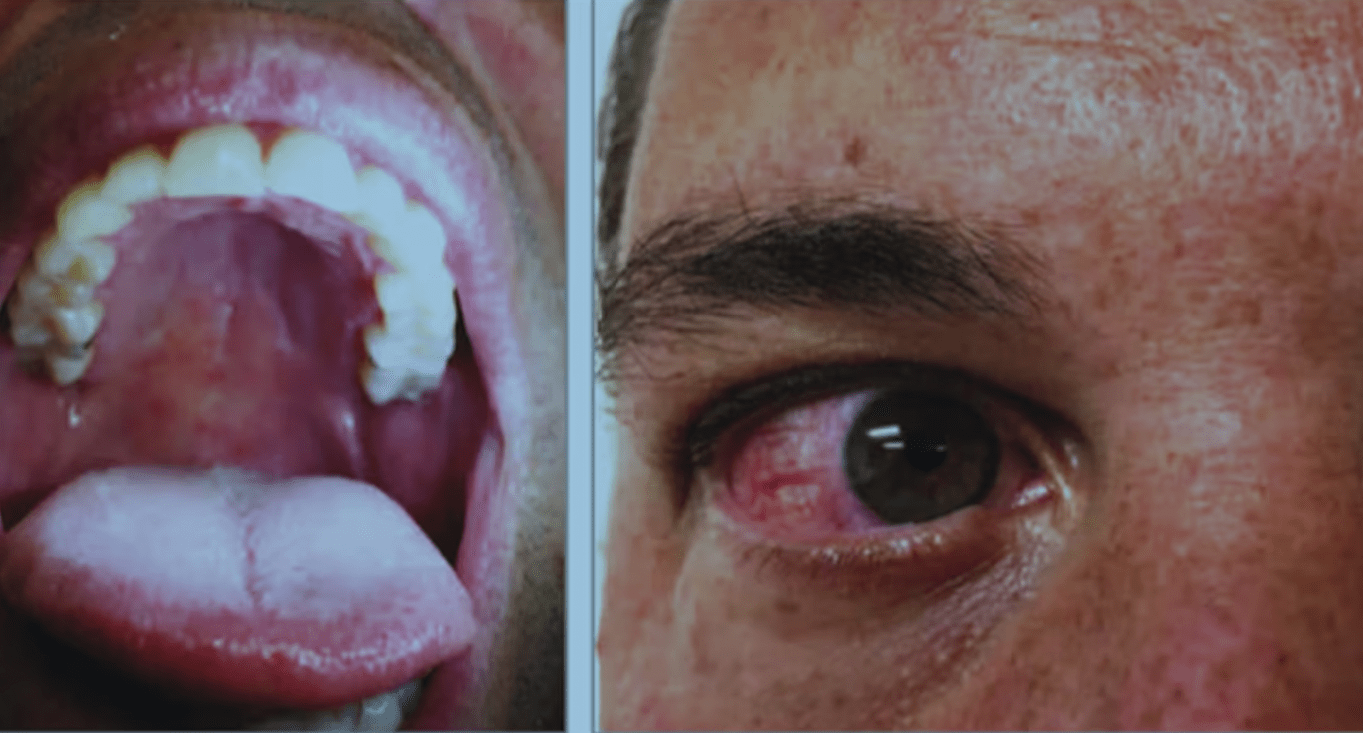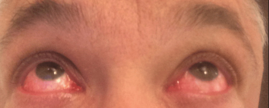 -  Conjunctival suffusion is highly suggestive (beefy red appearance of eyes, more uniform erythema than conjunctival injection)