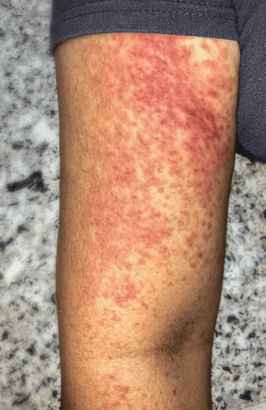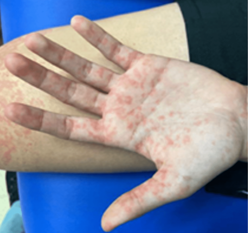 This illness is transmitted by mosquitoes. Should be considered in patients traveling from Central and South America, the Carribean, or Asia. You may have fever and arthralgias in addition to the findings below. This is the diagnosis.