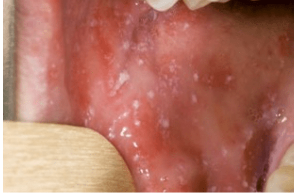A 3 y/o patient that is unvaccinated presents with cough and rhinorrhea. This is the oral exam. This is the diagnosis.