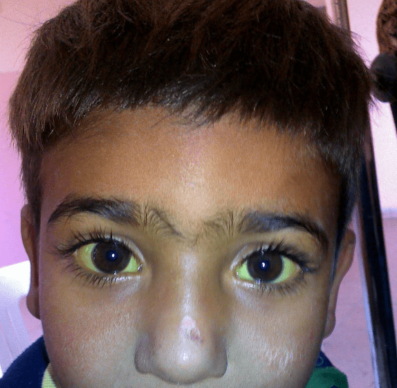 This zoonotic infection causes conjunctival suffusion, a red but nonpurulent appearance of the eyes, as well as marked hyperbilirubinemia with only mild elevations in AST/ALT.