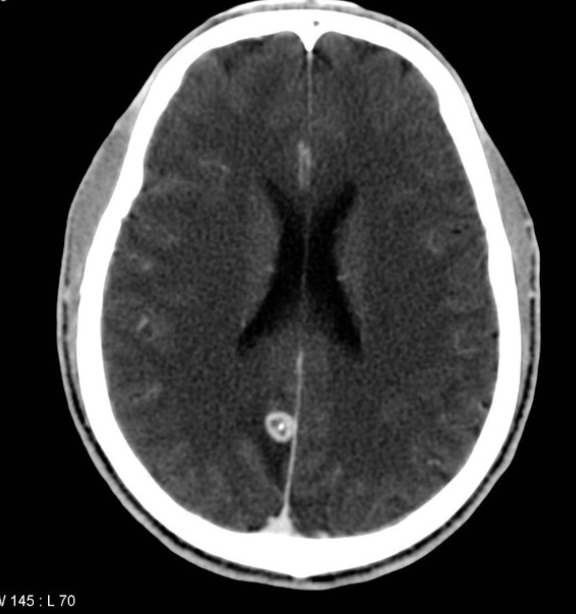 - MRI/CT head: cyst with scolex (cyst with dot sign)