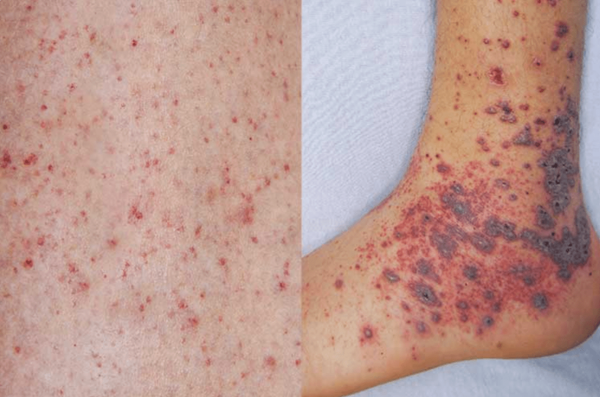 - hemorrhagic manifestations - petechiae, purpura, bleeding of gums, are common.