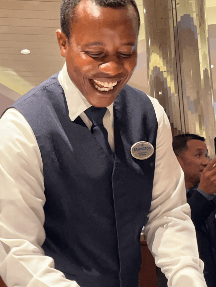 The main dining room is located on Deck __, __, and __. Our designated table was on Deck __ and our main servers were __ and __.