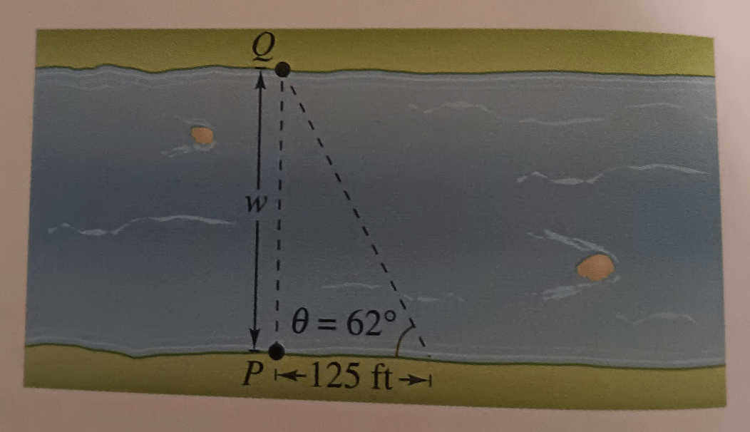 An engineer is trying to determine the width of a river. From point P, the Engineer walks downstream 125 feet and sights to point Q. From this sighting, it is determined that θ=62 deg. How wide is the river?