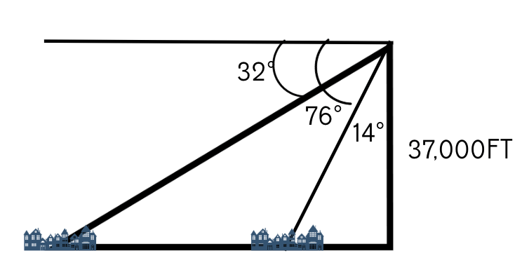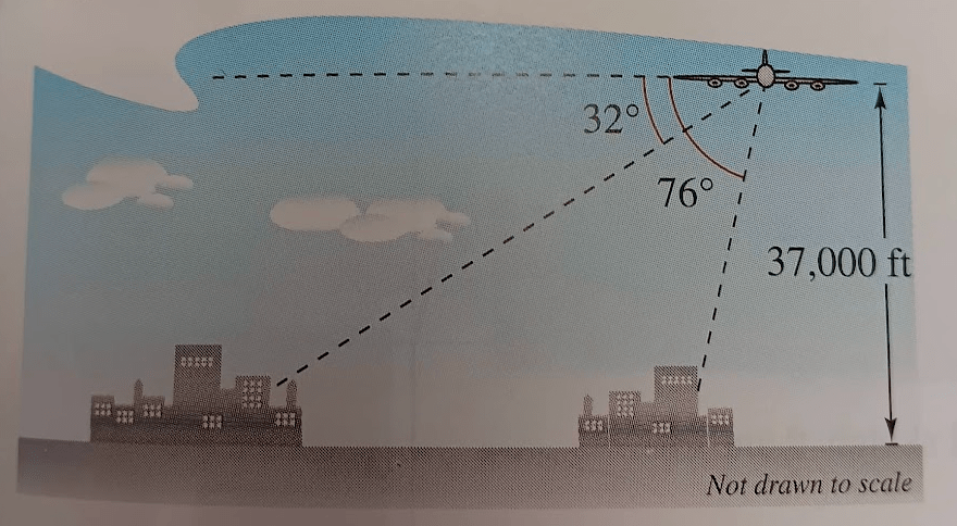 A passenger in an airplane flying at an altitude of 37,000ft sees two towns directly to the west of the airplane. The angles of depression to the towns are 32° and 76° (see figure). How far apart are the towns?