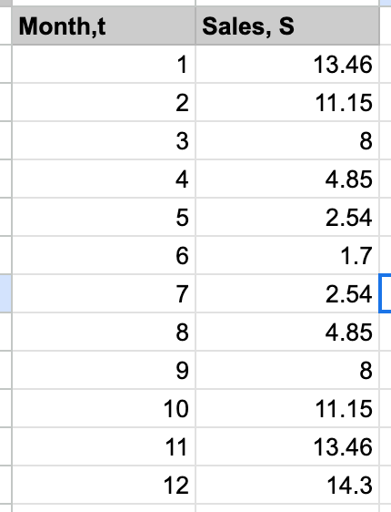 The tables shows the average sales S (in millions of dollars) of a outerwear manufacturers for each month t, where t=1 represents January.