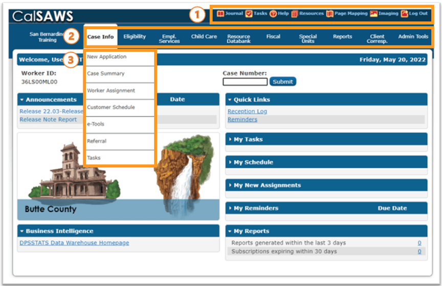 Task bar in CalSAWS where Workers can view e‑Application and eICTs. CalWIN Term: External Referral Screen
