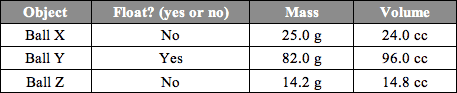 Three balls were measured and placed in a liquid. Based on the following data, what could be the density of the liquid? Round if needed.