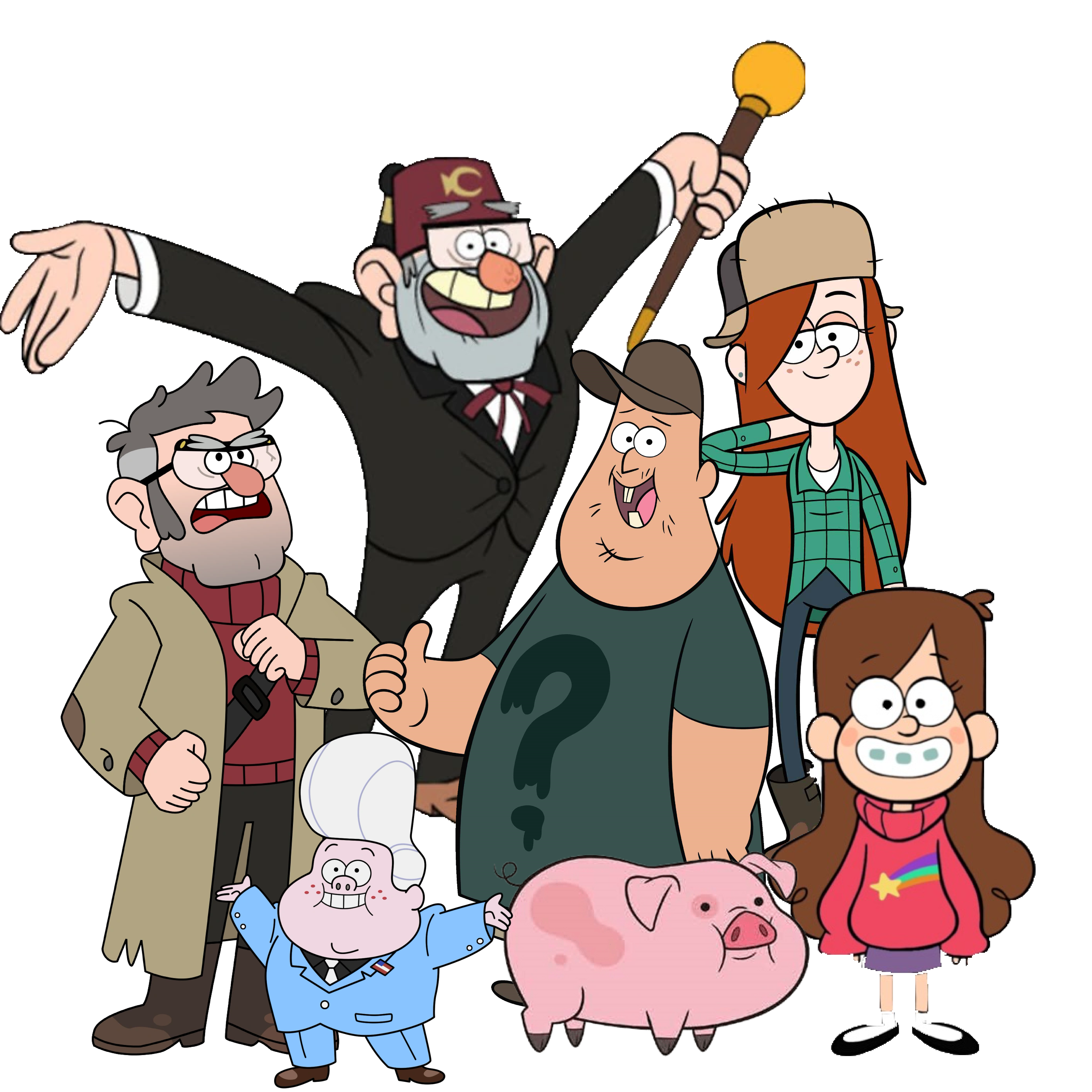 Stanley, Stanford, Soos, Wendy, Mabel, Waddles, and Gideon
