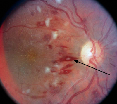 A 27-year-old woman comes to clinic because she has been feeling "under the weather" for the past 2 weeks. She has a history of mitral valve prolapse with mitral regurgitation and underwent oral surgery 2 weeks ago. Temperature is 38.5°C (101.3°F). A fundus photograph is shown. The skin shows 1- to 2-mm purple-red lesions on the legs and feet.