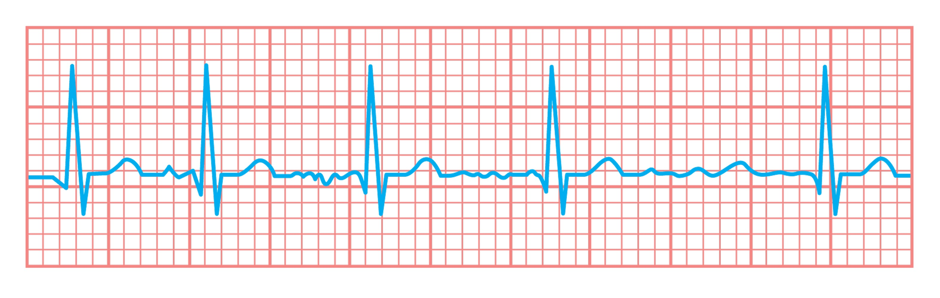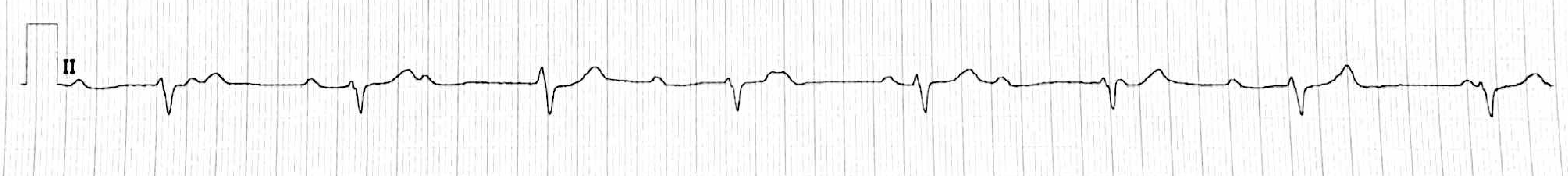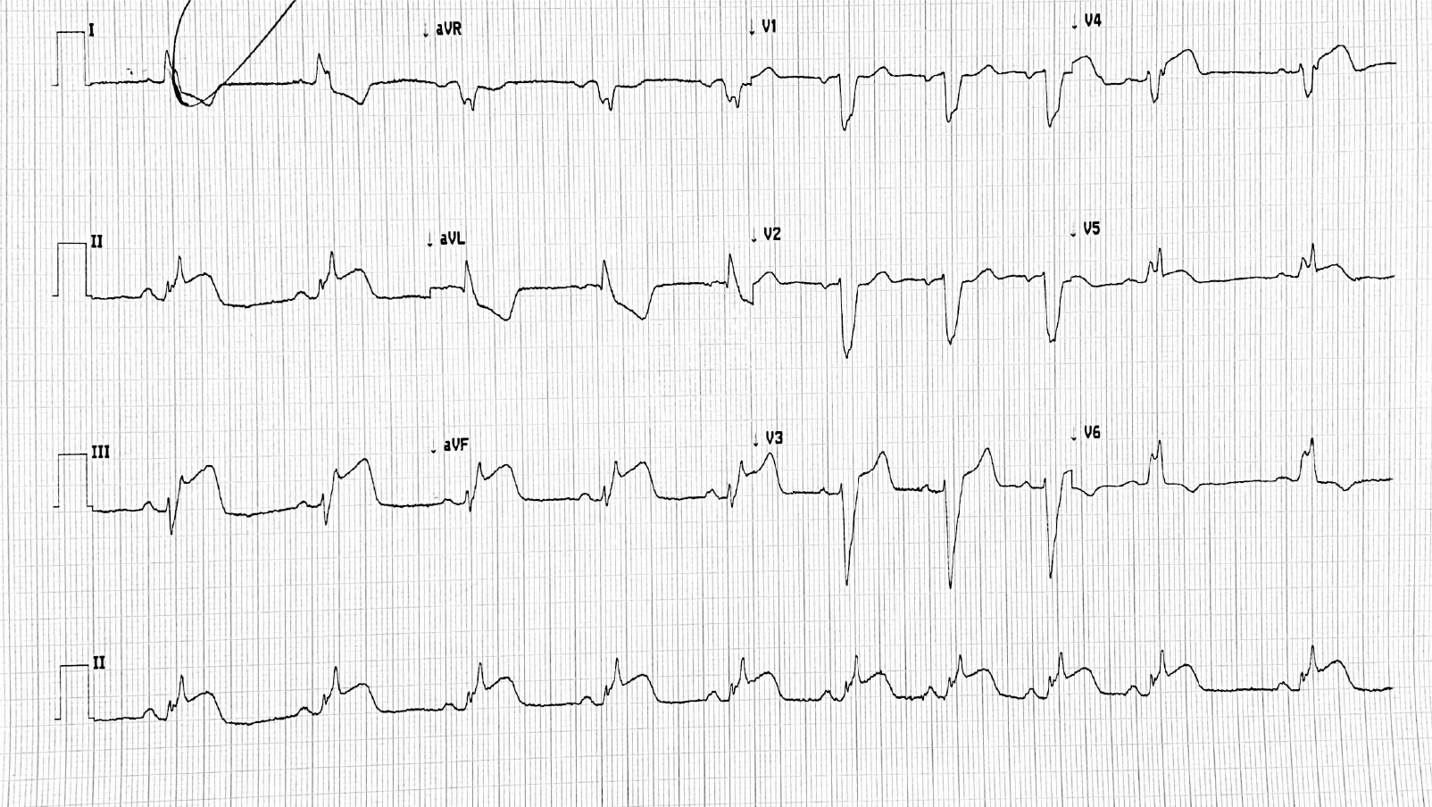 A 65-year-old man comes to the emergency department because of chest pain and difficulty breathing. He is diagnosed with an acute inferior wall ST-segment elevation myocardial infarction and quickly taken for percutaneous coronary intervention, which is successful. Eighteen hours later, he is stable and comfortable with normal vital signs and physical examination. Ten minutes later he becomes pulseless and unconscious. An ECG is shown.
