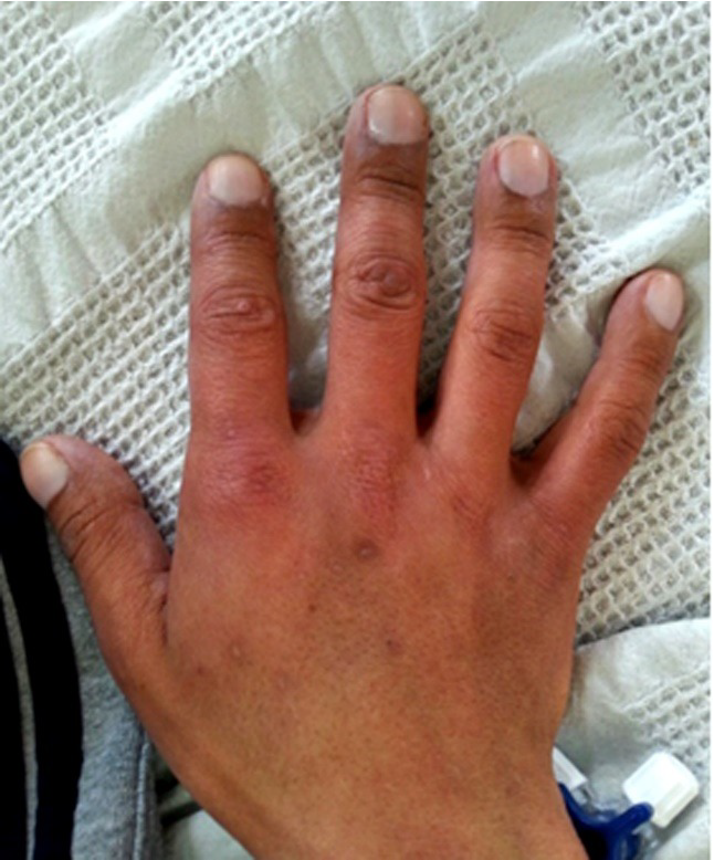 A 32-year-old woman comes to her physician because of increasing shortness of breath while walking up stairs. She has a history of a childhood heart murmur described as systolic, with a fixed, split S2 heart sound. Physical examination shows jugular venous distention, a right ventricular heave, and the hand findings shown in the photograph.