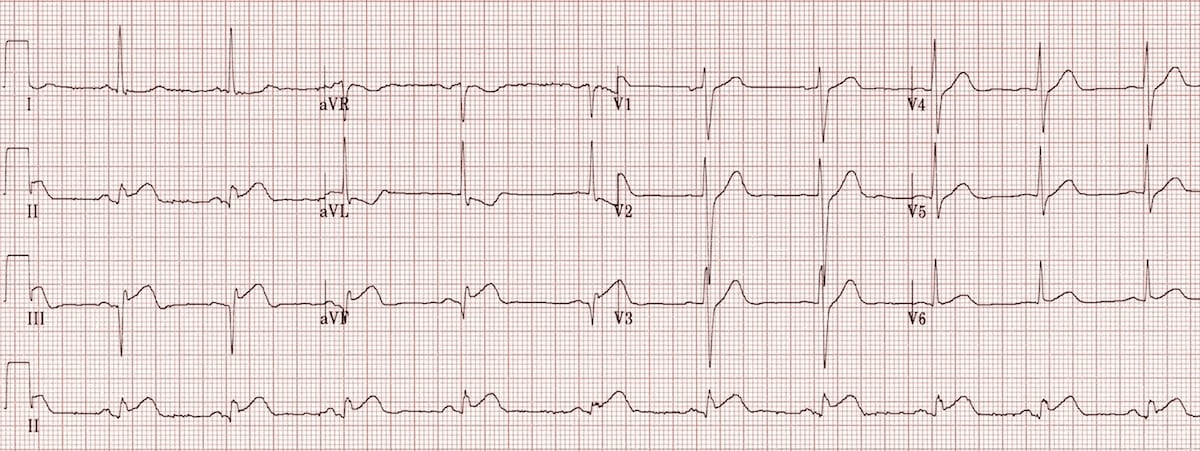 A 73-year-old man is evaluated in the emergency department for a 2-hour history of crushing chest pain and diaphoresis. An admission ECG is shown.