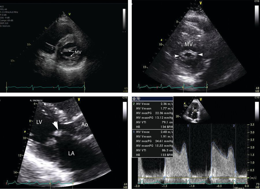 In the bottom left panel, diastolic doming (arrowhead) is present with a “hockey stick” deformity from mitral stenosis.