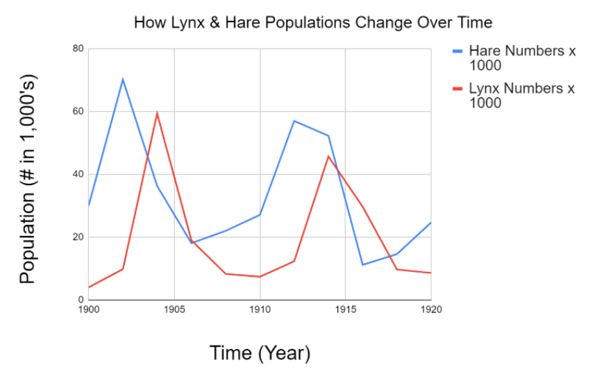 Based on this graph, what will happen to the lynx and hare populations over the next 15 years?