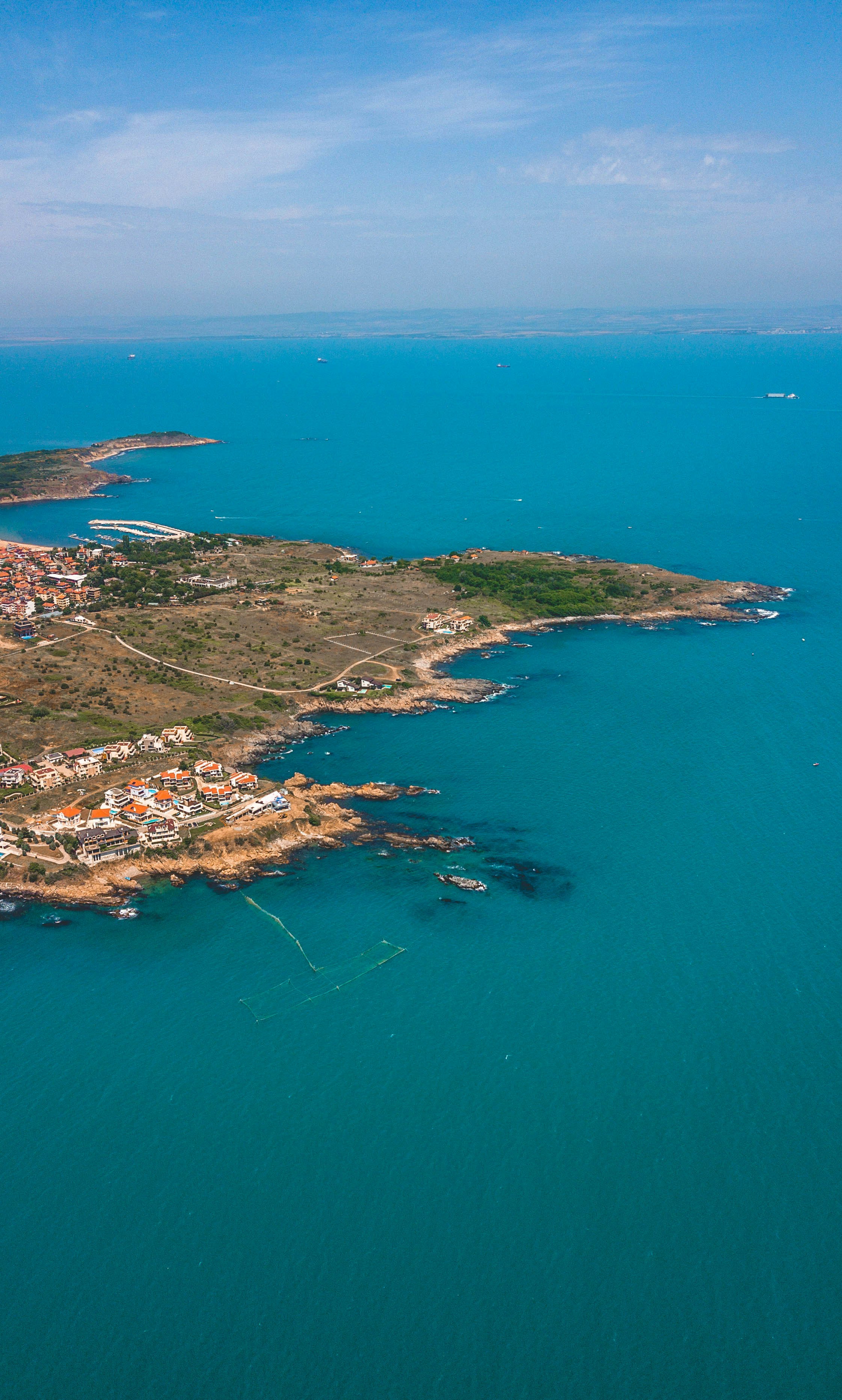 The land is surrounded by water on only three sides, while an island is land completely surrounded by water.